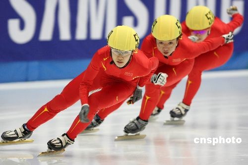 11月30日,短道速滑世界杯北京分站賽女子500米決賽結(jié)束,我國三名選手劉秋宏,付天余,趙楠楠以絕對優(yōu)勢包攬金銀銅牌。中新社發(fā) 王韶驊 攝