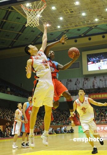 11月30日,2008-2009CBA聯(lián)賽常規(guī)賽第7輪比賽在山東濟南的比賽中,主場作戰(zhàn)的山東黃金男籃96:106不敵新疆廣匯男籃。中新社發(fā) 張侃 攝