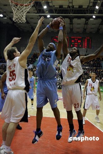 3日,08-09CBA聯(lián)賽第八輪的比賽北京金隅客場(chǎng)挑戰(zhàn)山西中宇在山西財(cái)經(jīng)大學(xué)體育館打響。北京金隅經(jīng)過(guò)四節(jié)苦戰(zhàn)在高命中率的情況下以110:105險(xiǎn)勝山西中宇。 中新社發(fā) 張?jiān)?攝