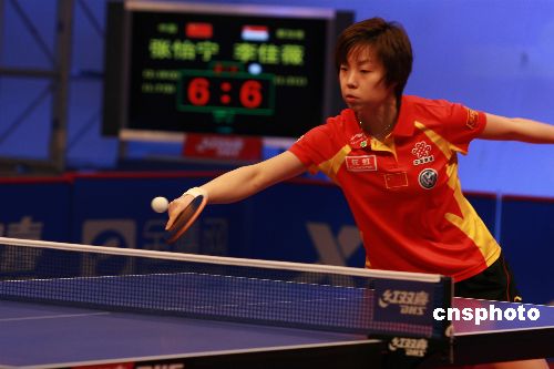 1月11日,在長(zhǎng)沙舉行的第三屆“世界乒乓球總冠軍賽”女單半決賽中,中國(guó)選手張怡寧、李曉霞分別戰(zhàn)勝對(duì)手晉級(jí)決賽。中國(guó)女單提前攬獲了本次總冠軍賽女單冠、亞軍。中新社發(fā) 鄧霞 攝