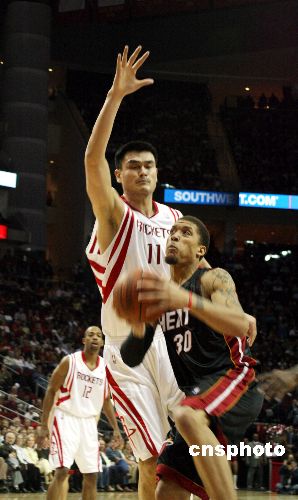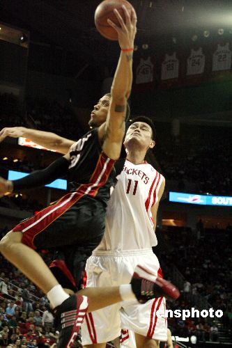 當(dāng)?shù)貢r(shí)間1月17日晚,主場(chǎng)作戰(zhàn)的火箭以93比86戰(zhàn)勝熱火,姚明全場(chǎng)十二投全中創(chuàng)個(gè)人進(jìn)攻記錄。中新社發(fā) 歐文 攝