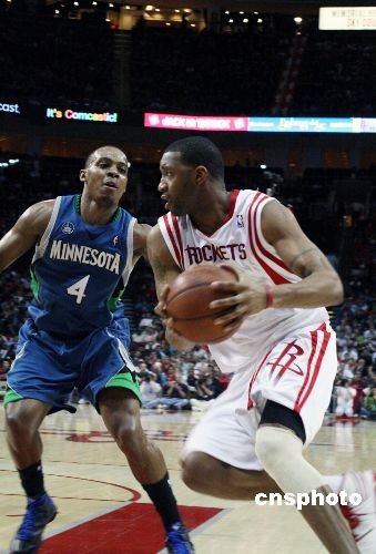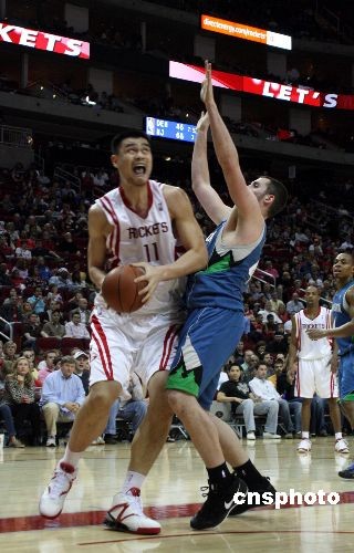 當(dāng)?shù)貢r(shí)間2月7日晚,休斯敦火箭在主場豐田中心迎戰(zhàn)西北賽區(qū)倒數(shù)第二的森林狼隊(duì)。結(jié)果火箭在上半場一度落后兩位數(shù),但憑借姚明和阿爾斯通等人在下半場的出色發(fā)揮,火箭最終以107-90擊敗森林狼避免了尷尬的連敗。姚明全場18次投籃12次命中,得到火箭最高的30分6個(gè)籃板5次蓋帽。中新社發(fā) 歐文 攝