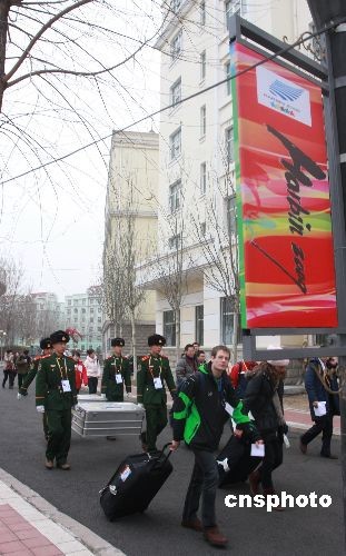 2月12日,黑龍江哈爾濱市,來此參加大冬會的德國代表團成員進入大冬會運動員村。當日,第24屆世界大學生冬季運動會黑龍江大學運動員村迎來首批客人。中新社發(fā) 王忠言 攝
