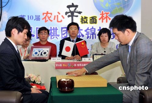 二月十七日,第十屆“農(nóng)心杯”世界圍棋團(tuán)體錦標(biāo)賽第三階段比賽在上海舉行,首戰(zhàn)由中國(guó)棋手常昊九段(右)挑戰(zhàn)日本擂主高尾紳路九段(左),本階段比賽將決出最后冠軍和2億韓元冠軍獎(jiǎng)金的歸屬。中新社發(fā) 湯彥俊 攝