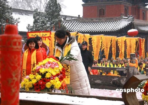 2月26日上午, 以“千年古廟會,萬姓拜羲皇”為主題的2009年中國·淮陽羲皇故都朝祖會在羲皇故都——河南淮陽舉行。奧運(yùn)會冠軍及金牌獲得者高敏、陳中、郭文珺、陸春龍、張湘祥、陸永、鄒市明、殷劍、楊秀麗等,參加朝祖會。圖為陳中向人文始祖伏羲敬獻(xiàn)花籃。中新社發(fā) 王中舉 攝