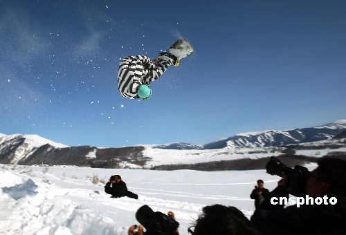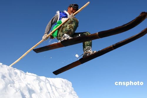 3月6日,首屆新疆喀納斯“雪上飛”杯單板野雪超級大回轉邀請賽,在新疆著名的旅游景點——喀納斯禾木村舉行,來自新疆各地7家滑雪場和單板俱樂部的37名選手參加比賽,演繹高山野雪的驚險與刺激。比賽間隙,專業(yè)運動員進行的單板跳臺特技表演與當地牧民進行的阿勒泰古老毛滑雪板表演令參賽選手大飽眼福。中新社發(fā) 劉新 攝
