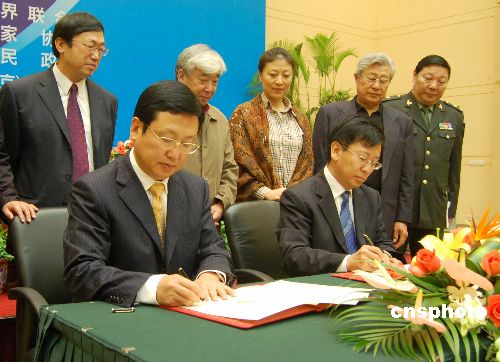 10月27日,由大連市人民政府申辦,經(jīng)中國文聯(lián)、中國電影家協(xié)會考察決定,第17屆中國金雞百花電影節(jié)將于2008年9月在大連市舉行。圖為大連市代表和中國電影家協(xié)會代表簽約。中新社發(fā) 邱勇 攝