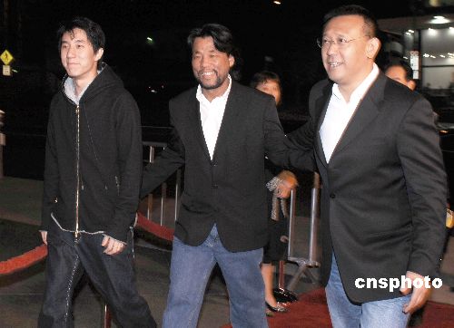 中美電影節(jié)十一月一日晚在好萊塢美國導(dǎo)演公會開幕,中國影星及導(dǎo)演姜文(右)和成龍之子房祖名(左)一起走紅地毯,出席《太陽照常升起》北美首映式。中新社發(fā) 賈國榮 攝