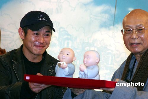十二月十六日,為宣傳新片《投名狀》先期抵臺(tái)的武打巨星李連杰,在臺(tái)北拜會(huì)法鼓山創(chuàng)辦人圣嚴(yán)法師,并贈(zèng)送二百張電影票,支持興建法鼓大學(xué)。圖為李連杰(左)接受圣嚴(yán)法師回贈(zèng)的兩只“慈悲小沙彌”。中新社發(fā) 董會(huì)峰 攝