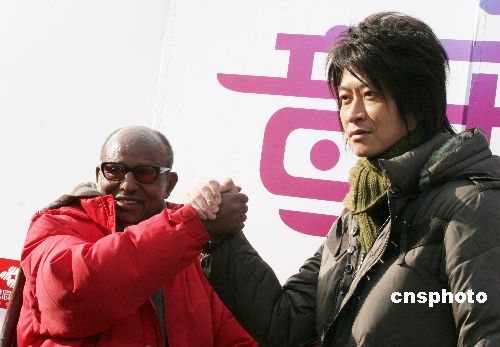 2008年1月2日下午,在北京林業(yè)大學體育場里,臺灣歌手游鴻明同坦桑尼亞奧運英雄阿赫瓦里共同完成奧運歌曲音樂電視《英雄》的場景拍攝。 中新社發(fā) 博芽影像 攝