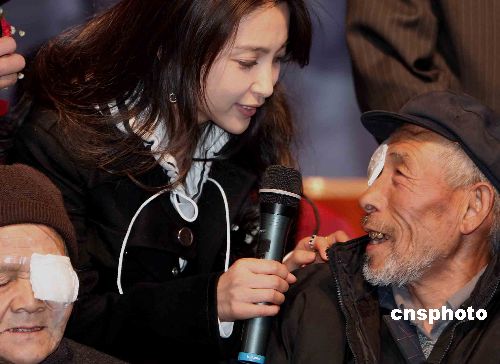 中國演藝明星李冰冰,1月28日在陜西省蒲城慰問剛剛通過慈善手術(shù)復(fù)明的貧困農(nóng)民白內(nèi)障患者。當(dāng)日揭牌的“陜西蒲城‘亮睛’扶貧眼科中心”,是由香港醫(yī)學(xué)界熱心人士發(fā)起、在香港注冊成立的“亮睛工程慈善基金”實施的“亮睛工程”的一部分,該工程計劃未來五年在中國人口多的貧困地區(qū)設(shè)立100個扶貧眼科中心(亮睛點),每個中心每年實施1000例白內(nèi)障手術(shù),大力協(xié)助中國的扶貧除盲重任。中新社發(fā) 任晨鳴 攝