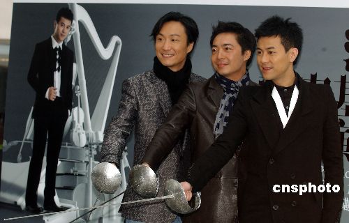 二月四日,香港歌星鄭中基(左)、梁漢文(右)與香港管弦樂團(tuán)(港樂)第一副團(tuán)長梁建楓,手持寶劍以“三劍俠”姿態(tài)宣布,三方將首度合作于二零零八年在紅館舉行三場演唱會。中新社發(fā) 蔡蔓莉 攝
