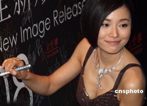 2月28日晚,香港紅星陳慧琳佩戴著價(jià)值千萬(wàn)的珠寶,在北京舉行的香港“金至尊珠寶”2008新形象發(fā)布會(huì)上亮相。同時(shí)亮相的還有藝人張恒、唐嫣、高露、江一燕、丁柳元、陳虹池以及名模春曉等。中新社發(fā) 錢興強(qiáng) 攝