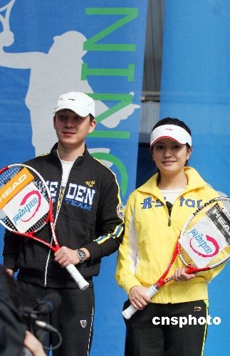 3月27日,2008“中網(wǎng)網(wǎng)動(dòng)中國(guó)”推廣活動(dòng)在北京航空航天大學(xué)網(wǎng)球館舉行。趙薇、潘粵明作為2008“中網(wǎng)網(wǎng)動(dòng)中國(guó)”的代言人出席該活動(dòng)。中新社發(fā) 博芽影像 攝