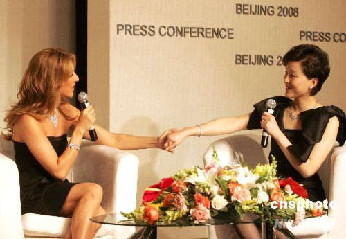 4月12日,國(guó)際歌壇天后席琳·迪翁與中國(guó)好友楊瀾在北京與記者見面,介紹她們聯(lián)手打造的頂級(jí)鉆石品牌HV Love。席琳·迪翁曾在榮獲奧斯卡多項(xiàng)大獎(jiǎng)的影片《泰坦尼克號(hào)》中擔(dān)任主唱。中新社發(fā) 張宇 攝