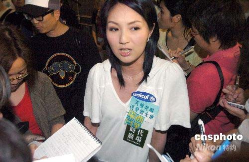 五月十六日晚,香港商業(yè)電臺在銅鑼灣時代廣場舉辦“天地共鳴送愛到大地”籌款活動,呼吁市民踴躍捐款,賑濟(jì)四川地震災(zāi)區(qū)。圖為香港歌星楊千嬅出席。中新社發(fā) 鄧慶樂 攝