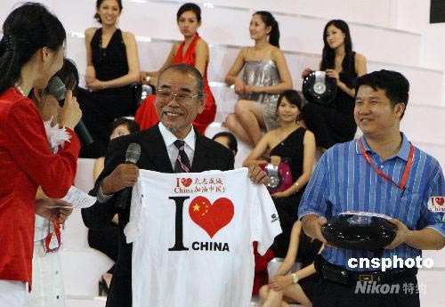 5月30日,在北京舉行的第17屆中國國際專業(yè)音響燈光樂器及技術(shù)展覽會上,卡拉OK之父井上大佑亮相雷石演出設(shè)備盛會現(xiàn)場,圖為在活動上井上大佑參加向中國四川地震災(zāi)區(qū)賑災(zāi)拍賣活動。中新社發(fā) 錢興強(qiáng) 攝