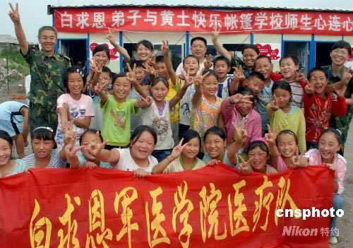 解放軍石家莊白求恩軍醫(yī)學(xué)院派出的心理支援隊,近日來到四川省安縣黃土鎮(zhèn)“快樂帳篷學(xué)!保蚝⒆勇男行睦碇гx務(wù),收到良好效果。中新社發(fā) 尹威華 攝