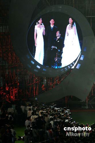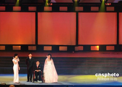 9月10日晚,在遼寧大連市舉行的第17屆金雞百花電影節(jié)開幕式上,高位截癱的大連志愿者、2008年殘奧會火炬手韓偉與女友陶璐舉行現(xiàn)場婚禮,并講述兩人因為電影而結(jié)緣的故事。在觀眾的見證下,兩人現(xiàn)場許下愛的誓言,交換婚戒。他們的愛情故事感動了現(xiàn)場的觀眾。影星鄧超為他們送上了自己的祝福。中新社發(fā) 劉德斌 攝