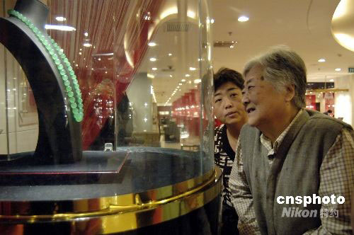 “十一黃金周”臨近,一款估價(jià)為1.2億元的天價(jià)翡翠項(xiàng)鏈亮相某珠寶商城,為節(jié)日市場(chǎng)先期預(yù)熱,由57顆顏色濃綠、質(zhì)地細(xì)膩的“老坑玻璃種”翡翠珠子串成的翡翠項(xiàng)鏈,懸賞總價(jià)值10萬元的翡翠飾品作為獎(jiǎng)品向全球征名,以期弘揚(yáng)中華傳統(tǒng)玉文化。中新社發(fā) 徐曦弋 攝