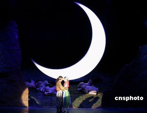 2008年11月7日晚,由寧夏銀川藝術(shù)劇院創(chuàng)作的中國(guó)第一部大型原創(chuàng)回族舞劇《月上賀蘭》在福州進(jìn)行專場(chǎng)慰問(wèn)演出。舞劇反映了在千百年前的古絲綢之路上,一支來(lái)自西域的商隊(duì)歷經(jīng)艱險(xiǎn),在當(dāng)?shù)貪h族及其他少數(shù)民族的幫助下,戰(zhàn)勝各種困難,完成了穿越沙漠、東渡黃河的商旅使命。在這一過(guò)程中,來(lái)自西域的青年納蘇與漢地姑娘海真相互愛(ài)慕,產(chǎn)生了真摯的愛(ài)情。也正是這種真愛(ài),超越了民族、信仰、習(xí)俗的界限,使這一對(duì)戀人在賀蘭山下結(jié)為夫婦,繁衍生息。舞劇以其曲折的劇情、優(yōu)美的舞姿、豪華的燈光和富有真實(shí)感的布景,贏得了觀眾的高度贊揚(yáng)。中新社發(fā) 汪虎 攝