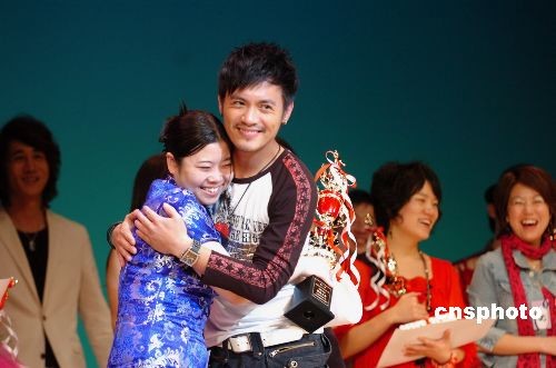 11月17日晚,第11屆日中卡拉OK大賽決賽在日本東京練馬文化中心舉行。這項(xiàng)連續(xù)舉辦了十一年的中國(guó)人唱日本歌、日本人唱中國(guó)歌的民間歌賽已漸成一知名品牌受到兩國(guó)文化愛(ài)好者的歡迎。因主演了創(chuàng)下臺(tái)灣票房奇跡的影片《海角七號(hào)》而炙手可熱的臺(tái)灣當(dāng)紅小生范逸臣此次作為特邀嘉賓出席大賽,不僅獻(xiàn)唱了三首代表作更親為獲得最優(yōu)秀獎(jiǎng)的選手頒獎(jiǎng)。圖為范逸臣為獲獎(jiǎng)選手頒獎(jiǎng)后與其擁抱祝賀。中新社發(fā) 朱沿華 攝
