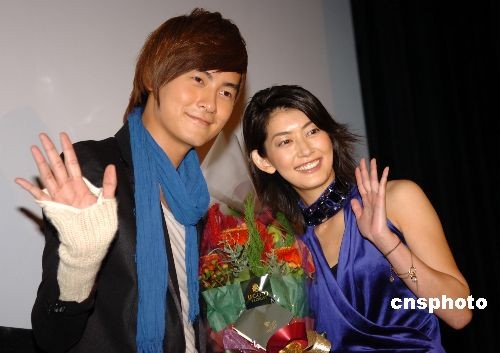 11月18日,臺灣人氣小生鄭元暢在東京助陣日本版《惡作劇之吻》的DVD發(fā)賣,并首次與日版“相原琴子”的扮演者佐藤蘭子碰面。二人本別披露各自的拍攝內(nèi)幕,令現(xiàn)場近二百名粉絲大笑不已。圖為鄭元暢與佐藤蘭子在活動現(xiàn)場向合影。中新社發(fā) 朱沿華 攝