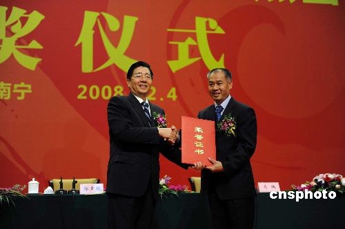 十二月四日,中共廣西壯族自治區(qū)委員會(huì)、廣西壯族自治區(qū)人民政府授予著名導(dǎo)演張藝謀“廣西杰出貢獻(xiàn)獎(jiǎng)”,獎(jiǎng)勵(lì)一百萬元人民幣。中新社發(fā) 蔣雪林 攝