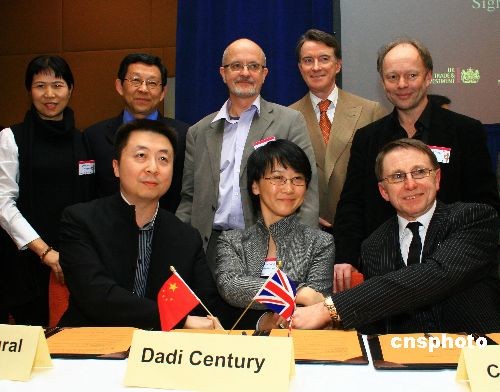 當?shù)貢r間2月27日下午,中國商務部長陳德銘(后左二)和英國商業(yè)、企業(yè)和制度改革大臣曼德爾森(后右二)共同見證了中英企業(yè)合拍電影《楊貴妃》的簽約儀式。圖為北京春秋鴻文化投資有限公司、大地時代文化傳播(北京)有限公司與英國Capital Music公司的代表簽署1400萬美元合拍協(xié)議。中新社發(fā) 李鵬 攝