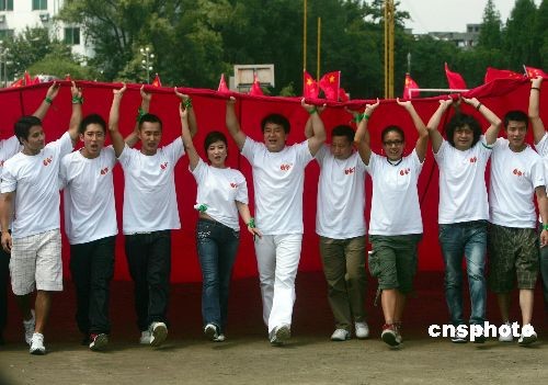五月十一日下午,時(shí)值汶川大地震一周年之際,新中國(guó)成立六十周年獻(xiàn)禮歌曲《國(guó)家》主唱成龍、劉媛媛等主創(chuàng)成員來到位于四川綿陽的北川中學(xué),與全體師生共同開展“國(guó)家·愛”主題紀(jì)念活動(dòng)。圖為成龍、劉媛媛與北川中學(xué)萬名師生共擎巨幅國(guó)旗。這幅國(guó)旗面積有五千平方米,重量約四百公斤,是面積最大的中國(guó)國(guó)旗。中新社發(fā) 南星 攝