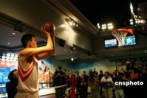 NBA中國(guó)球員姚明的蠟像18日首次在紐約杜莎夫人蠟像館與公眾見面,引來(lái)眾多媒體關(guān)注。 中新社發(fā) 李靜 攝