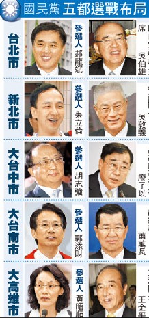 據(jù)了解,黨中央規(guī)劃的陣容,大高雄市由王金平出任,臺北市由吳伯雄擔任,新北市交給吳敦義負責,大臺中市是由曾任臺中縣長的廖了以擔綱,大臺南市則由出身嘉義市的蕭萬長出馬。