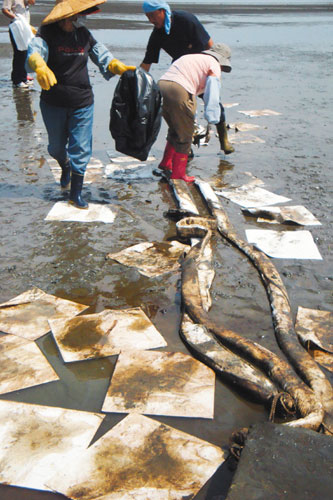 由于油污面積很大,大批消防及環(huán)保人員在濕地忙著除油,將吸油棉布丟入海灘,并布下攔油索框住油污,保護水筆仔、彈涂魚等自然生態(tài),相關(guān)單位表示,初步已控制,油污不再擴散,攔油工作一直持續(xù)中。