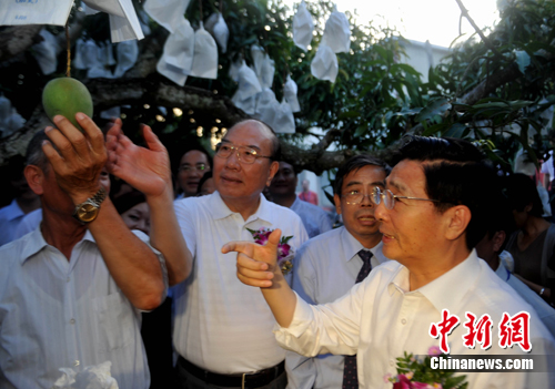 郭聲琨說,我們來到臺灣,向農(nóng)民兄弟學(xué)習(xí)水果的生產(chǎn)和品種的研發(fā),以及水果的營銷。剛才看了你們的果園,我非常高興,因為臺南和附近幾個縣的水果品質(zhì)相當優(yōu)良,你們的種植技術(shù)相當先進,研發(fā)力量也非常強大。廣西和臺灣均處在北回歸線上,氣候地理條件非常相近,廣西和臺灣的農(nóng)產(chǎn)品有很多互補和相似的地方。我們這次來,一是來學(xué)習(xí),二是來尋找合作機會,三是采購水果和農(nóng)產(chǎn)品。我們希望通過農(nóng)產(chǎn)品的采購活動,今后能夠建立經(jīng);、制度化的采購制度安排,使得兩岸、特別是桂臺之間的農(nóng)產(chǎn)品和水果,形成采摘季節(jié)、品種及果品質(zhì)量上的互補。我相信這對我們雙方都有利,這樣可以惠及臺灣廣大果農(nóng),豐富廣西的水果市場。