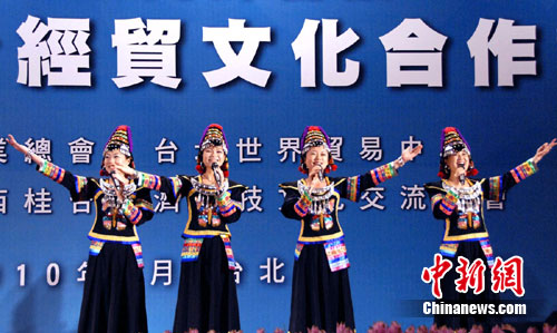 中新網(wǎng)臺(tái)北7月4日電(廖祖平)中共廣西壯族自治區(qū)委員會(huì)書記郭聲琨率領(lǐng)1000余人的廣西經(jīng)貿(mào)文化代表團(tuán)7月1日—7月5日在臺(tái)灣參訪,這是海峽兩岸經(jīng)濟(jì)合作框架協(xié)議(ECFA)簽署后大陸第一個(gè)赴臺(tái)的經(jīng)貿(mào)文化代表團(tuán)。客家人聚居的廣西賀州市也由市委書記彭曉春率賀州代表團(tuán)隨廣西團(tuán)一起赴臺(tái)。7月3日下午,由桂臺(tái)(賀州)客家文化旅游合作示范區(qū)與臺(tái)灣世界客屬總會(huì)、廣西同鄉(xiāng)會(huì)聯(lián)合主辦的桂臺(tái)(賀州)客家文化旅游經(jīng)貿(mào)合作懇談會(huì)在臺(tái)北舉行。