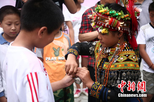 記者在現(xiàn)場(chǎng)看到,來(lái)自臺(tái)灣阿里山鄉(xiāng)達(dá)邦國(guó)小和屏東縣泰武國(guó)小的28名小朋友,為遭受“5.12”地震的北川羌族民眾戴上平安珠手鏈。來(lái)自臺(tái)灣屏東縣三地門(mén)鄉(xiāng)的王蕓說(shuō),希望平安珠能保四川災(zāi)區(qū)羌族人民平安。北川羌族民眾為參訪團(tuán)代表敬獻(xiàn)了羌紅,將平安送給臺(tái)灣“8.8”風(fēng)災(zāi)少數(shù)民族人民。