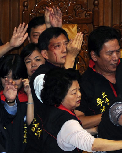 臺“立法院”臨時會今天審議ECFA(兩岸經(jīng)濟合作框架協(xié)議),由于民進黨暴力阻撓表決,現(xiàn)場爆發(fā)肢體沖突,多名“立委”掛彩,混亂中通過將ECFA等案徑付二讀。