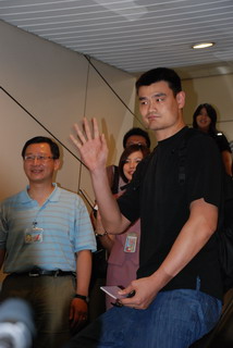 據報道,來臺灣參加慈善活動的美國職籃火箭隊當家中鋒姚明,26日下午搭乘華航班機來臺,立刻受到大家熱烈包圍,桃園縣長吳志揚前往機場接機,贈送桃園縣農特產品給姚明,希望在臺灣期間可以好好品嘗一下,姚明也回贈這次活動一件球衣給吳縣長。