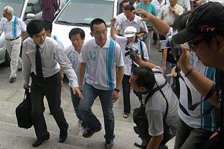 陳致中(前左 2)被《壹周刊》爆料疑涉召妓。陳致中26日由律師陪同到高雄地方法院提出民事告訴,向《壹周刊》求償新臺(tái)幣200萬(wàn)元。 圖片來(lái)源:“中央社”