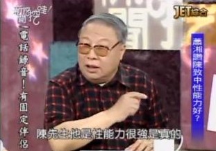蕭湘居士在節(jié)目中談到,一般說法鼻子大代表性能力強,其實以中醫(yī)觀點看來,要看性能力好壞與否重點在下巴。他說,下巴屬水、額頭屬火,水系統(tǒng)包括泌尿、生殖,恰巧陳致中下巴“又厚又長”,所以性能力好。