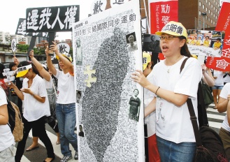中新網(wǎng)8月12日電 “日本政府,道歉賠償!”日本首相菅直人前天向韓國(guó)道歉“曾經(jīng)殖民支配”,臺(tái)灣婦女救援基金會(huì)、臺(tái)灣戰(zhàn)俘營(yíng)紀(jì)念協(xié)會(huì)等民間團(tuán)體,11日赴“日本交流協(xié)會(huì)”前抗議并要求完成“歷史記憶拼圖”,不過交流協(xié)會(huì)代表僅接下抗議信,不愿完成拼圖。