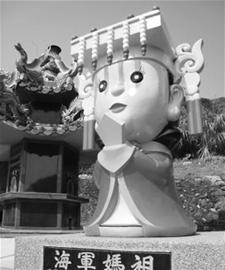 除了天顯宮,與臺軍方關系相當密切的廟宇,還有蘇澳中正軍港內(nèi)的媽祖廟進安宮。30多年來,進安宮成為當?shù)毓俦男叛鰧ο螅餍蛙娕炦M港都會前往祈福。去年底蘇澳民眾請示媽祖后,還捐資建立了一座高達3米的“海軍媽祖”石像(如圖),成為軍港的地標,據(jù)稱歷任海軍高級將領幾乎都會來這里上香。作為全臺唯一軍方與地方共管的廟宇,民眾到進安宮參拜媽祖,還要先登記,并且只有假日才能進香。