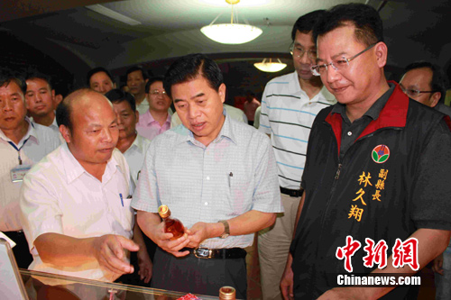 中新社苗栗8月19日電 (記者 張傳熙)正在臺灣山區(qū)縣苗栗訪問的廣東省省長黃華華,當(dāng)看到苗栗出產(chǎn)的用草莓做成的酒類商品、糖果、糕點琳瑯滿目、擺滿當(dāng)?shù)靥禺a(chǎn)商場貨架時大為贊嘆,連聲說:“苗栗農(nóng)產(chǎn)品開發(fā)了不得!”他希望廣東與苗栗加強(qiáng)合作,推動水果業(yè)的發(fā)展,推動兩地觀光農(nóng)業(yè)的交流。