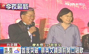 昨晚在永和市樂華夜市,“立委”廖本煙唱“小城故事”,他好幾次想找機(jī)會把麥克風(fēng)往蔡英文面前比,但她像看到火把,馬上靠邊閃。不過電視畫面顯示,蔡英文也還是首度突破自我,開始開口唱歌,看她嘴型,咬字還蠻完整。