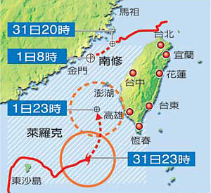 中新網(wǎng)9月1日電 據(jù)臺灣《聯(lián)合報》報道,昨晚八點(diǎn)半,臺灣“氣象局”發(fā)布臺風(fēng)“萊羅克”海上警報,今天凌晨兩點(diǎn)半再度發(fā)布陸上警報。移動速度緩慢的“萊羅克”正在打轉(zhuǎn),今明兩天是最靠近臺灣的時候,今晚暴風(fēng)邊緣可能在臺灣西南沿海附近。另外,臺風(fēng)“南修”也會影響臺灣部分地區(qū)。