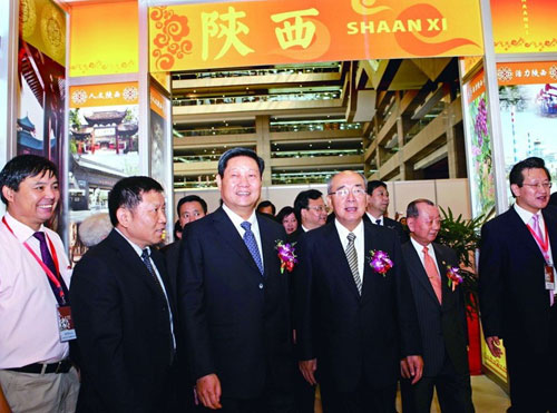 當(dāng)日上午九時許,在悠揚古樸的秦腔曲牌聲中,“陜西風(fēng)情節(jié)”在臺北世貿(mào)中心拉開帷幕,近百家企業(yè)的300多種產(chǎn)品吸引了諸多臺灣民眾。趙正永、景俊海和吳伯雄以及臺灣商業(yè)總會理事長張平沼等在參觀展覽之后,出席了活動開幕式。趙正永在致辭中說,兩岸經(jīng)濟(jì)具有很強的互補性,不斷加強交流與合作,對于應(yīng)對國際金融危機(jī)和促進(jìn)經(jīng)濟(jì)持續(xù)發(fā)展具有重要意義。隨著“三通”的實現(xiàn),陜臺兩地的交流合作領(lǐng)域不斷擴(kuò)大、態(tài)勢越來越好。為進(jìn)一步凝聚共識、互惠發(fā)展,在臺灣有關(guān)方面的大力支持下,我們赴臺舉辦包括“陜西風(fēng)情節(jié)”等許多活動在內(nèi)的“2010臺灣陜西周”,相信這次活動會使臺灣企業(yè)和民眾更多地了解陜西,推動陜臺合作向更高層次發(fā)展。吳伯雄在致辭中對我省舉辦臺灣陜西周表示熱烈歡迎,他說,秦中自古帝王州,陜西是中華文化的發(fā)祥地,工業(yè)基礎(chǔ)較好,資源豐富,有眾多的高校和科研單位,與臺灣有著良好的往來,臺灣陜西周文化交流、認(rèn)親拜友、科技聯(lián)盟的主題,都是與臺灣合作中非常重要的問題,陜西也具備這樣的條件和基礎(chǔ),希望以這次活動為新的契機(jī),不斷推動陜臺合作向更多更寬的領(lǐng)域發(fā)展。作為陜西省政府高級經(jīng)濟(jì)顧問的張平沼,以切身經(jīng)歷說明了大陸與臺灣加強合作的重要性,表達(dá)了進(jìn)一步加強合作的愿望。