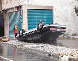 中新網(wǎng)9月20日電 據(jù)臺灣《聯(lián)合報》報道,臺風(fēng)“凡那比”(大陸稱“凡亞比”)強(qiáng)勁,花蓮刮起17級強(qiáng)風(fēng),一整排十多輛轎車車窗被吹裂“開花”,轎車四腳朝天,摩托車騎士閃躲滿天飛舞的招牌鐵片,有民眾以“血滴子”來形容它的恐怖。