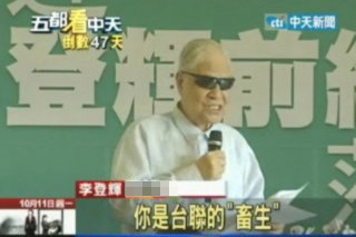 中新網(wǎng)10月12日電 據(jù)臺灣“今日新聞網(wǎng)”報道,“你是臺聯(lián)(‘臺聯(lián)黨’)的‘畜生’!”李登輝11日在替民進黨新北市長參選人蔡英文站臺時出現(xiàn)口誤;蛟S是真的年紀大了,李登輝這次替蔡英文助陣,不但講到激動處時,手抖個不停,還口誤連連,讓坐在一旁的蔡英文只能尷尬地笑。