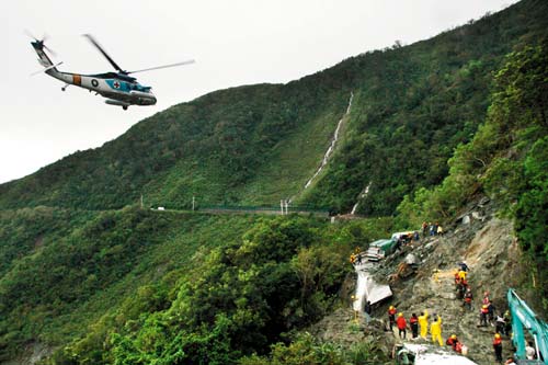 空援同時,臺軍特種作戰(zhàn)部隊、消防部門特種搜救隊都出動,“公路總局”以重型機(jī)具清道,只是山坡壁已成泥石漿,才一挖,旁壁的土石又流下,如此重復(fù)施作,最后終于勉強(qiáng)清出一條便道。