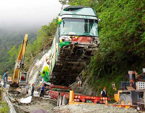 據(jù)報(bào)道,這輛車嚴(yán)重變形,車頭還掛有浙江團(tuán)的名牌,由于車內(nèi)塞滿土石,工人用鐵鍬從破損的車窗挖除土石,輪胎放氣,還出動(dòng)推土機(jī)幫吊起的游覽車喬位置,花了半個(gè)小時(shí),才順利把游覽車拖運(yùn)下山。